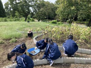 生徒たちは熱心に雑草を取り除き、土壌を整える作業に取り組みました。遠方にある花壇は、地域の方々や訪れる人々の目に触れる大切な場所です。