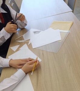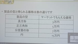③生徒は4つのグループに分かれ、先生からはさみや白紙、○や△の型紙が入っている大きな封筒を受け取りました。袋の中身は、バラバラです。はさみが入っていなかったり、型紙がなかったり。生徒は他のグループから必要な物を貸し借りしなければなりません。それから、各グループでできるだけ多く○や△の形を切り抜くのです。それが、上の図(左)のようなお金に変わります。