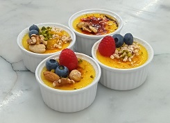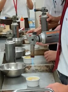 ⑤午後は金沢製菓調理専門学校で調理実習をしました。生徒はガスバーナーで焦げ目を付けて、フルーツをトッピングしました。おいしそうなクリームブリュレの完成です!